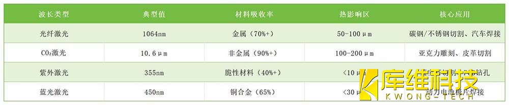 激光波长(单位:nm/μm)决定光子能量与材料吸收特性: