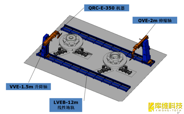 根据驱动箱焊接结构尺寸特点和要求分析,焊接工作站为双机器人双工位机器人焊接工作站,两条平行的12m有效行程地面轨道上各安装有一个三维伸缩臂,每套伸缩臂上配有一套七轴弧焊机器人,两机器人可独立工作或者一同工作,如图2所示。弧焊机器人采用QRC-E-350型号关节型手臂机器人,其所有轴都有一个极大的旋转范围,使其具有非常大的灵巧性能和工作范围。机器人的手臂设计细长而紧凑,且各轴的动态性能高,保证了优良的焊接精度、速度和可重复性。