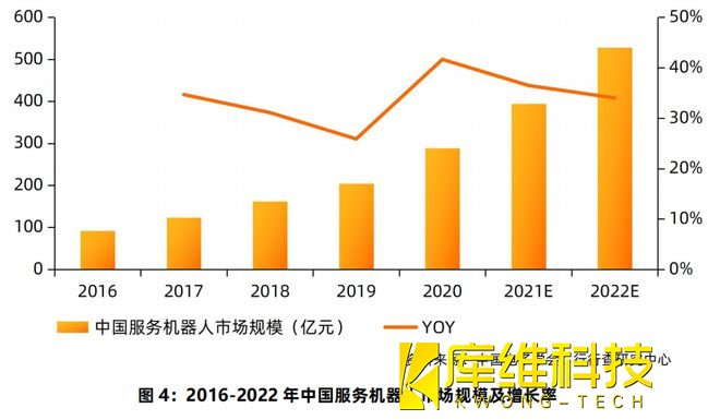 2021年我国服务机器人市场规模预计达到393.3亿元,2016-2021年的年均复合增速达34%,市场规模总体增速高于工业机器人。近年来,服务型机器人产品的消费需求不断升级、消费群体日益扩大,C端市场应用渗透率不断提升,预计2022年我国服务机器人的市场规模将达到500-550亿元。