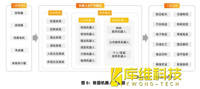 机器人产业链主要分为上游核心零部件研发与生产、中游本体制造和系统集成,以及下游各行各业的具体应用等三方面: