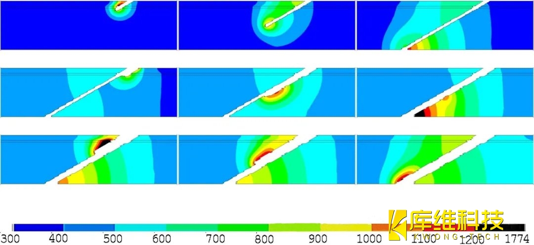 2、水导激光打孔角孔时,孔前缘仅在打孔开始时经历高温。随着钻孔向下移动(以螺旋方式),高温区域已完全包含在激光照射区域内,从而实现无分层钻孔。这与毫秒激光钻孔相反,在毫秒激光钻孔中,从钻孔过程开始到结束,在孔的前缘可以观察到有明显更高的温度。