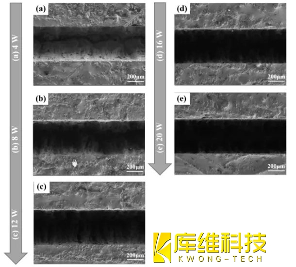 通过图中不同激光功率下的水导激光对陶瓷材料切槽的 SEM 图像,我们能够更加直观地观察到加工效果的差异。激光功率的提升,会致使陶瓷材料表面的熔融区宽度以微米级的幅度递增。而随着扫描速度的增加,材料的烧蚀深度减小但烧蚀效率提高。水导激光切槽陶瓷材料的表面形貌相对较好。