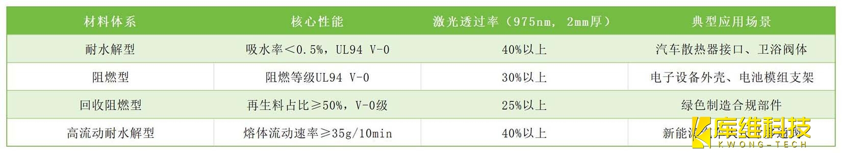 激光透射焊接的核心瓶颈在于??透光层材料的光学性能与功能性平衡??。传统PA66-GF30材料虽具备优异力学性能,但其激光透过率受玻纤分散性、吸湿性影响,难以满足复杂工况需求。通过配方创新与工艺优化,构建了多维度材料解决方案: