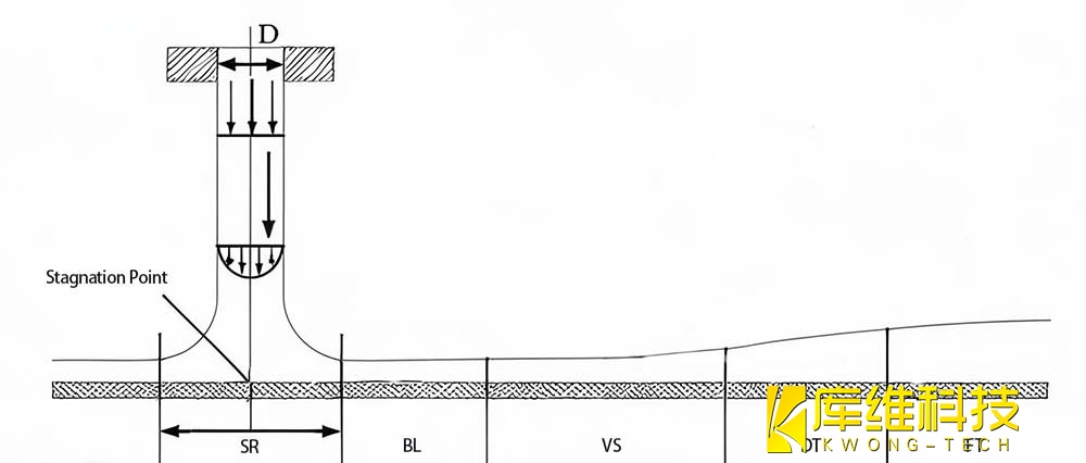 如图3所示,射流冲击加工表面后形成驻点(Stagnation Point),水流在此处分裂为薄层液膜(Stagnation Region, SR)。随后依次形成: