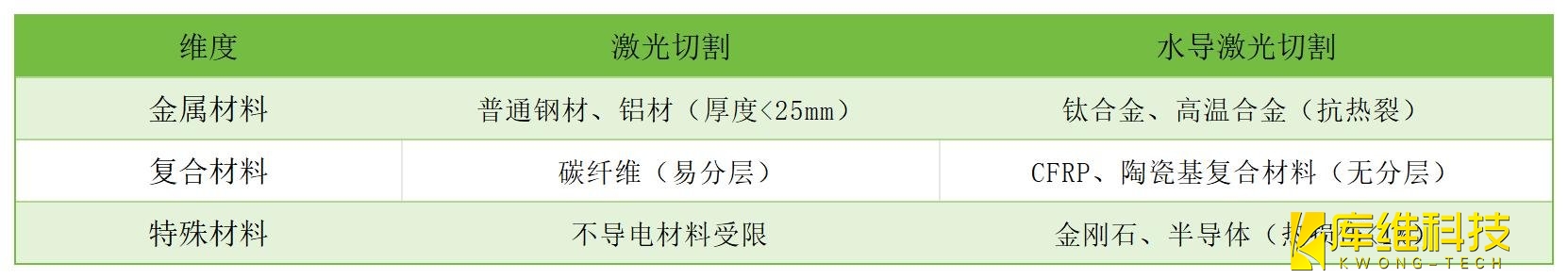 ??激光切割对导电金属效率更高,但复合材料易产生分层;水导激光通过水流抑制热应力,可加工高硬度、热敏感材料。