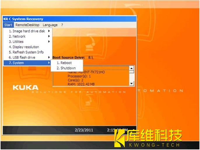 7. 库卡机器人控制系统关机,拨出 U 盘,然后重启控制系统。